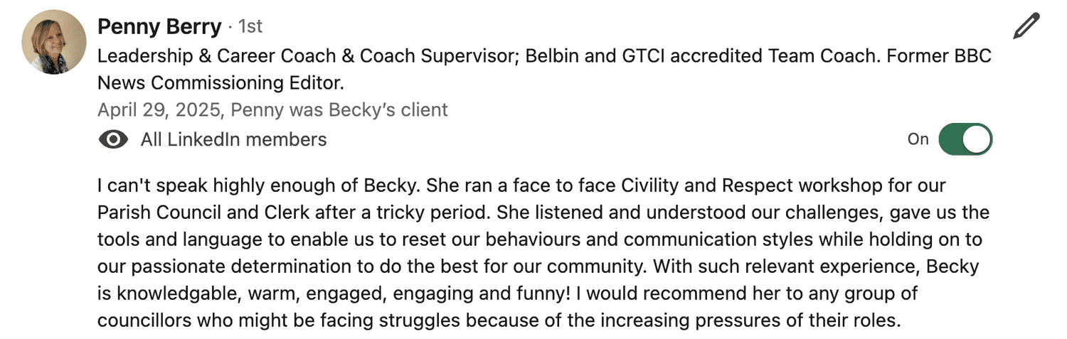 This training is drawn from the Civility and Respect webinar programme I created for the Society of Local Council Clerks (SLCC), National Association of Local Councils (NALC) and One Voice Wales (OVW).